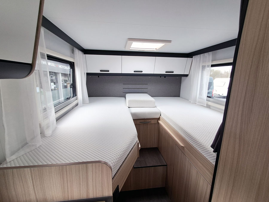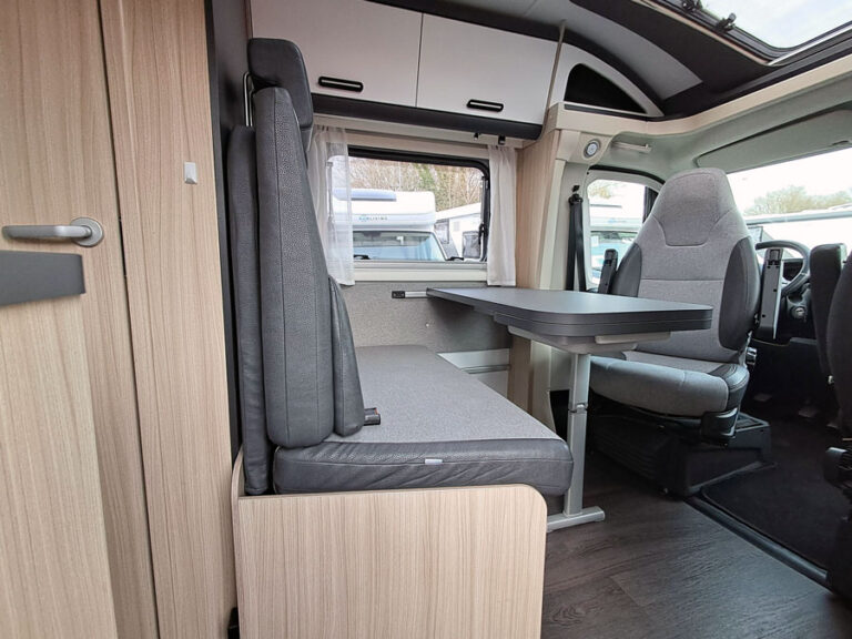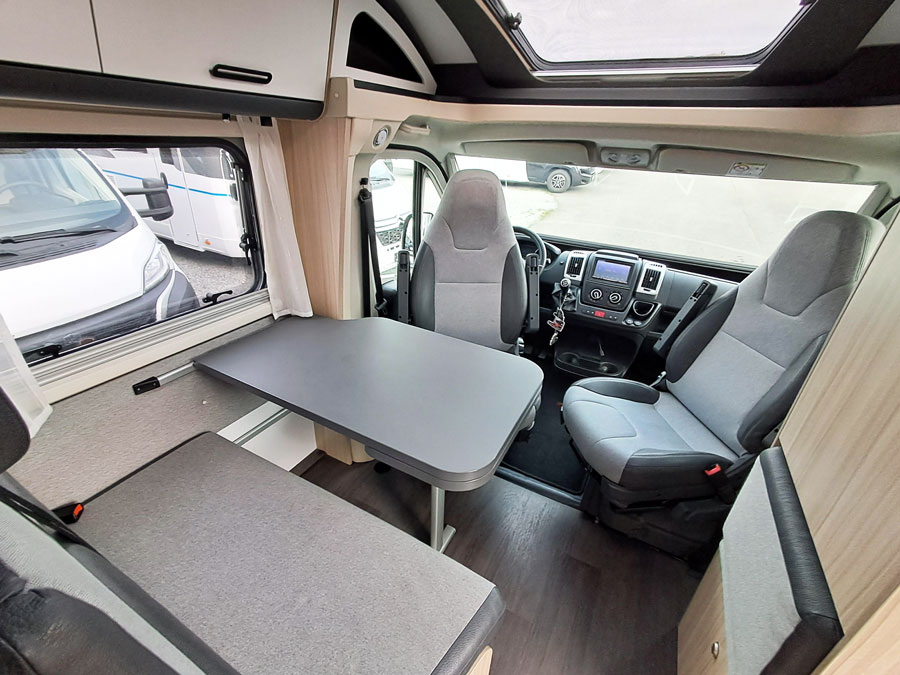 • Cabine voor- en zijramen met plissé verduisterd
