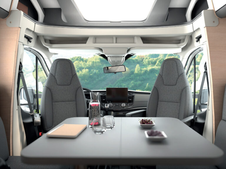 • Cabine voor- en zijramen met plissé verduistering;